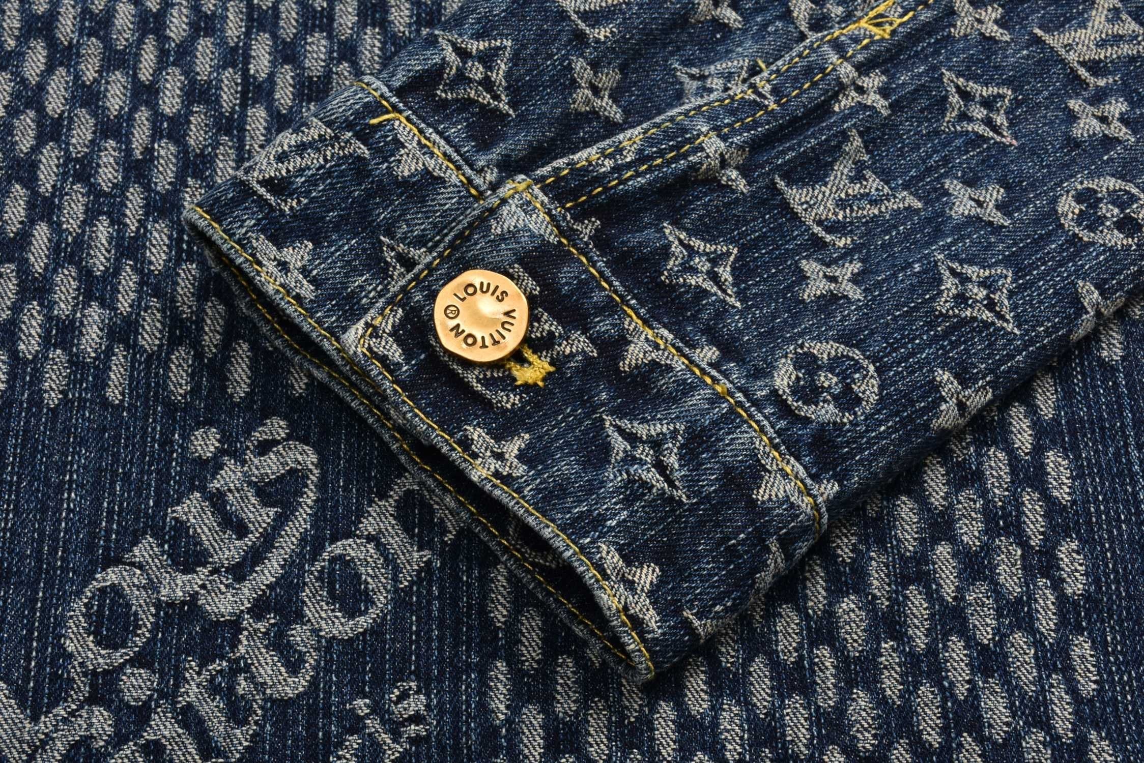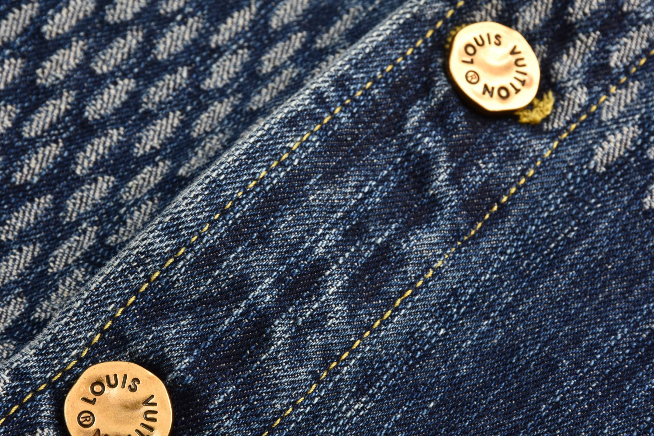 The fabric is made of bamboo cotton denim jacquard fabric, the pattern is aligned left and right, the pattern is cut to size, the hardware buttons are molded, the collar and cuffs are jacquard, and the individual pieces are cut to achieve neat alignment.