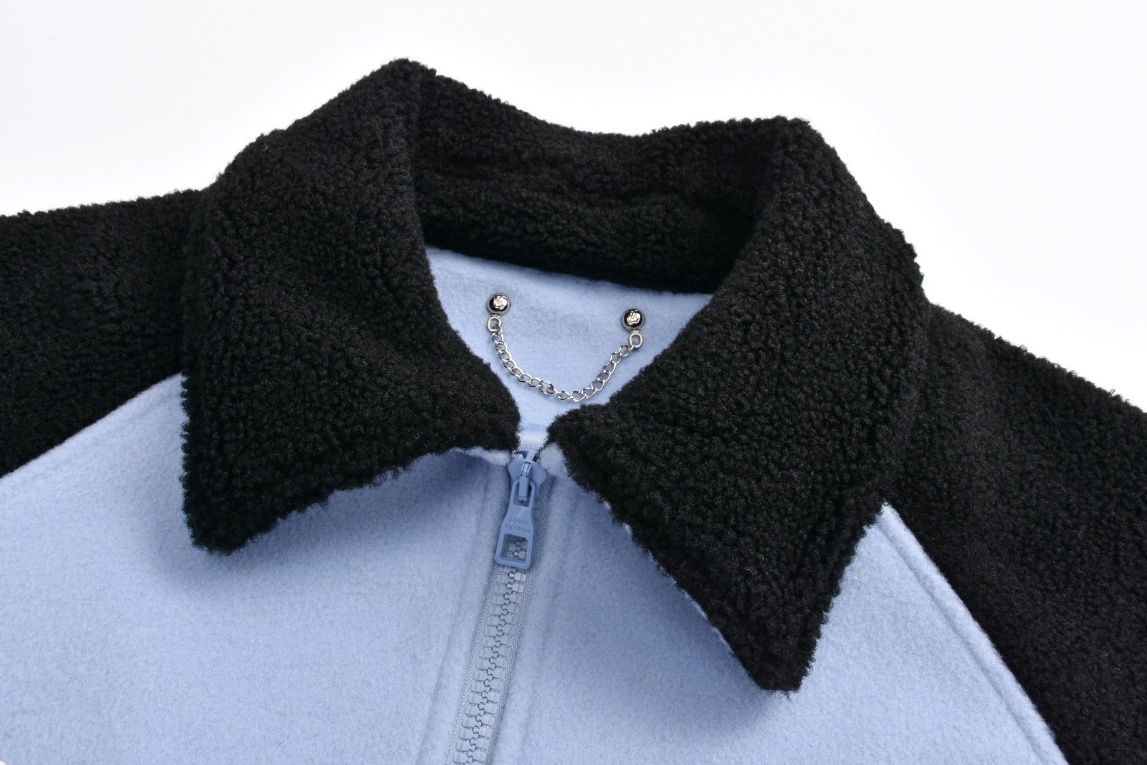The blue fabric is made of 60% wool + 20% cotton + 10% nylon + 10% polyester blend. The original paper pattern development perfectly guarantees the clothing style and the upper body effect. The high-end fabric is matched with customized shell pearls. The black fabric is made of 30% wool and 70% lambskin, which feels soft. The thread is woven with 2*2 pure cotton yarn, and the lining is matched with Tencel a100+ base lining. The collar steel bar is original molded and customized with electroplating and engraving, and the original customized washing label accessories