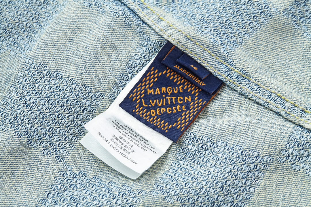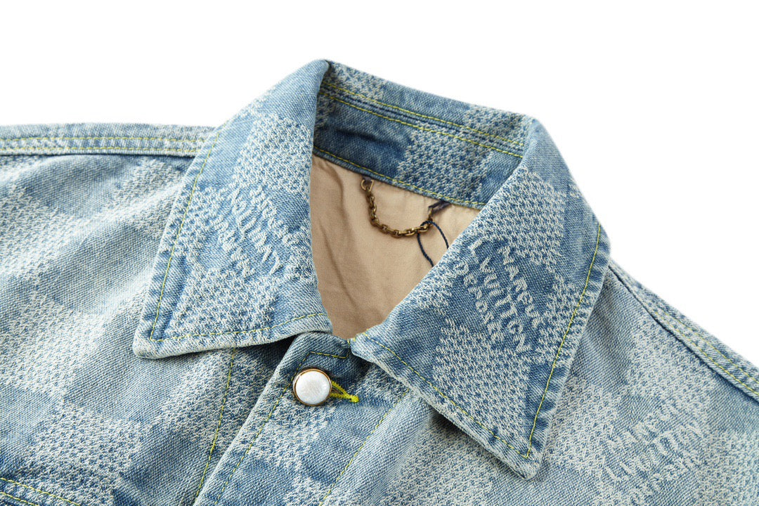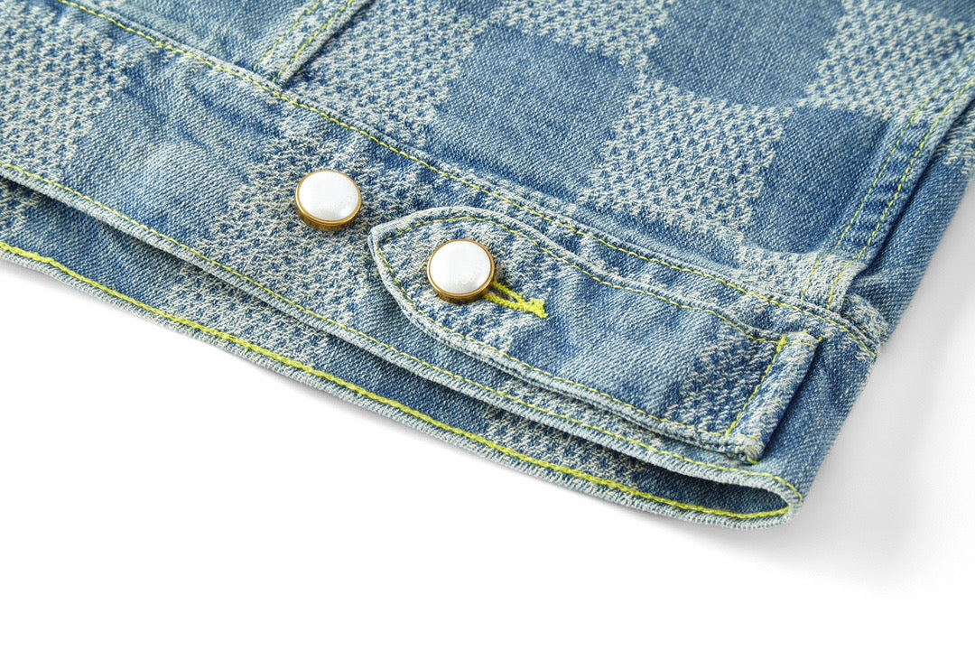 The fabric is made of woven denim twill, and the indigo effect is dyed to make a 3D checkered jacquard process. Through the yarn-dyed jacquard process, various patterns and designs are directly woven into the weaving process, making the surface of the denim present a richer texture and visual effect. The fabric is sand-washed and dyed with special technology. The natural wear and fading effect of the denim after washing presents a whitening and distressed effect, making it look more retro and historical. The flower-matched patch pocket design, the threshold is opened and closed with a new pearl button, the pearl surface engraving is clear and delicate, environmentally friendly electroplating, and the leather hook is matched with a bronze chain. The lapel design and buttoned cuffs condense the style of the season, and are suitable for matching with the same style.