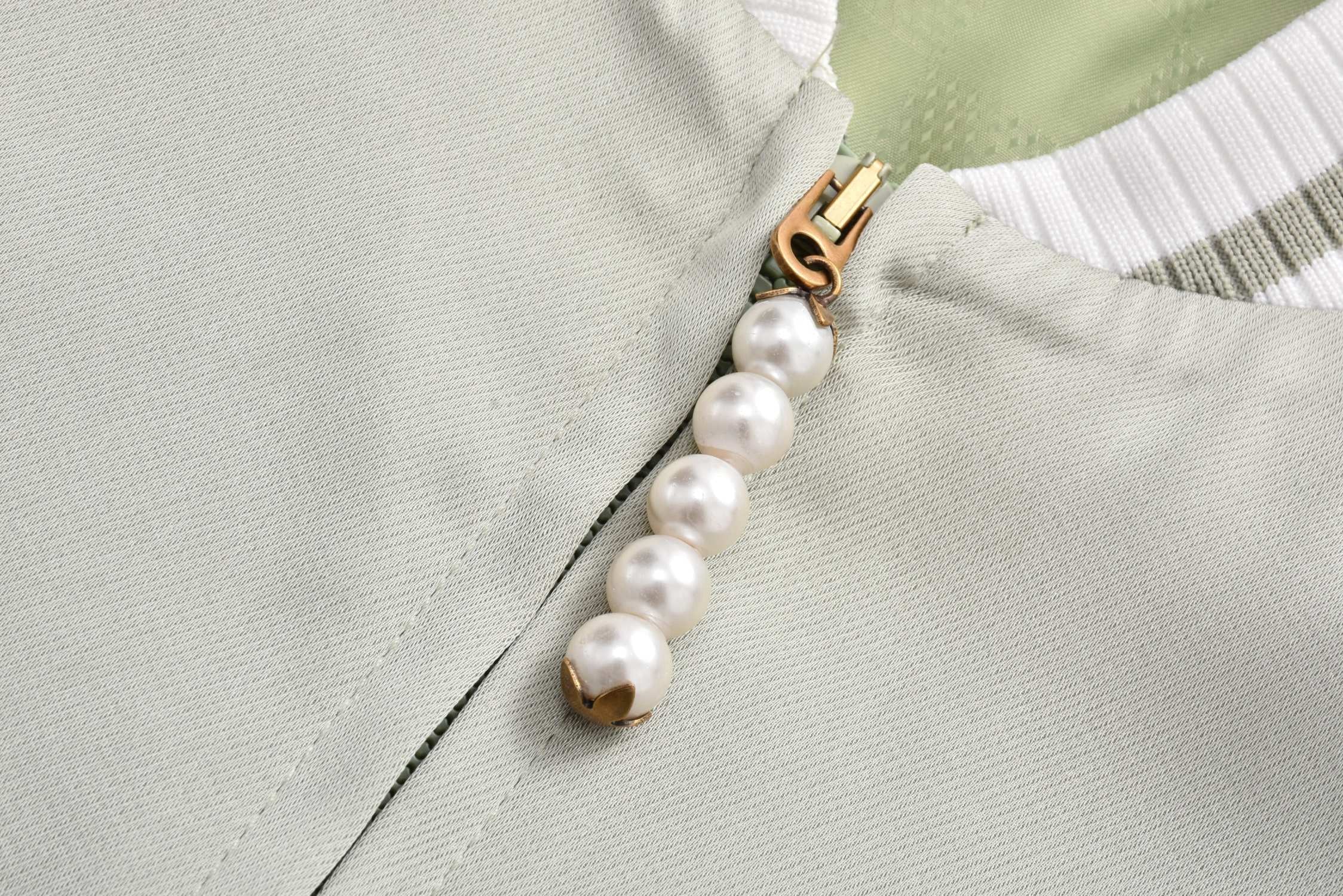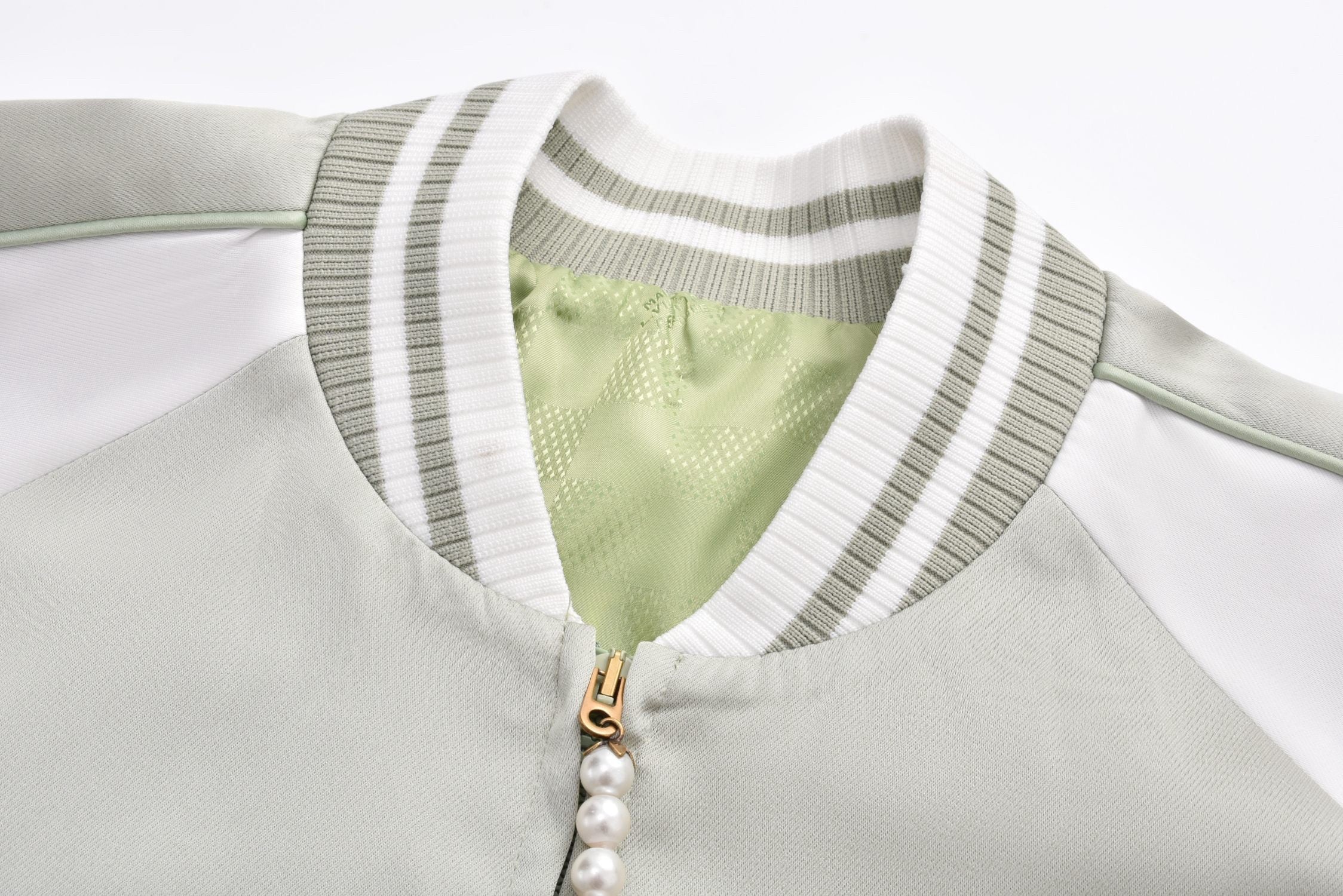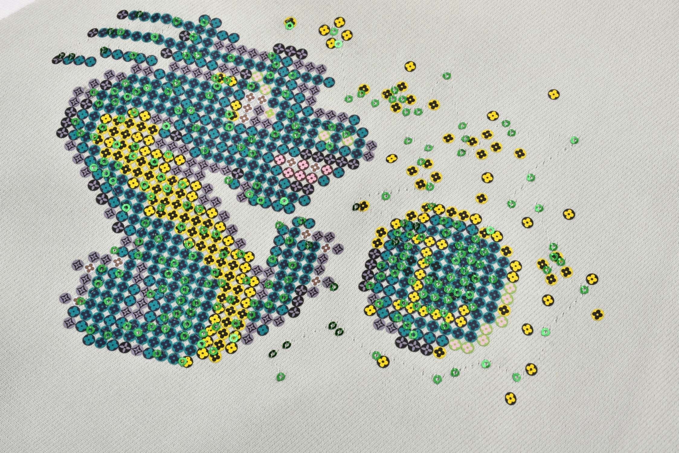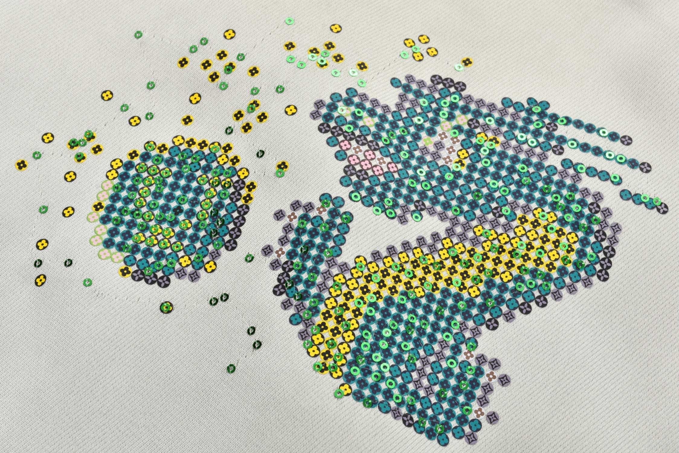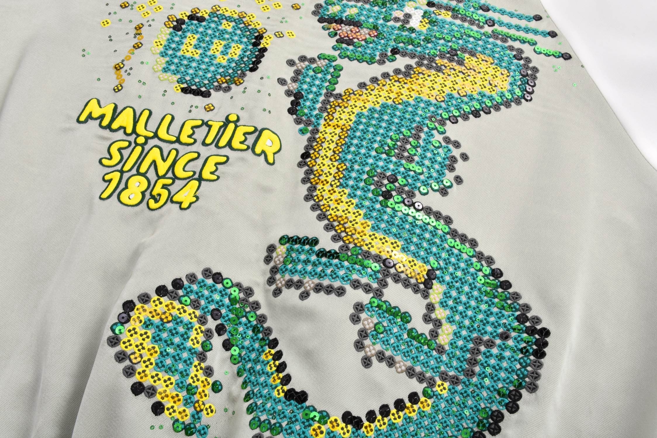 The woven and dyed acetate silk material (different from the polyester version on the market) adds a silky feel, a custom checkerboard effect silk jacquard lining, a floral beaded zipper pull, a central zipper front sleeve trim, striped ribbed collar hem and cuffs, front trim pocket details, and a high degree of integration of overall sequins and embroidery, upgrading the elegant style with humorous elements. The overall sequins and embroidery are highly integrated, with ribbed two-color yarns and ribbed weaving on a flat knitting machine. The flying dragon pattern is cleverly integrated into the floral print sequin embroidery, and the beaded zipper pull is a finishing touch, making it a trendy choice for both day and night.